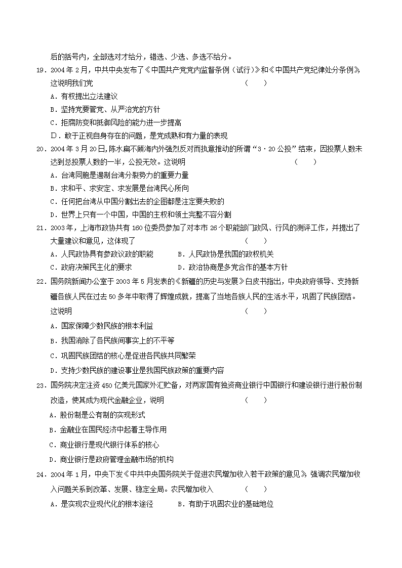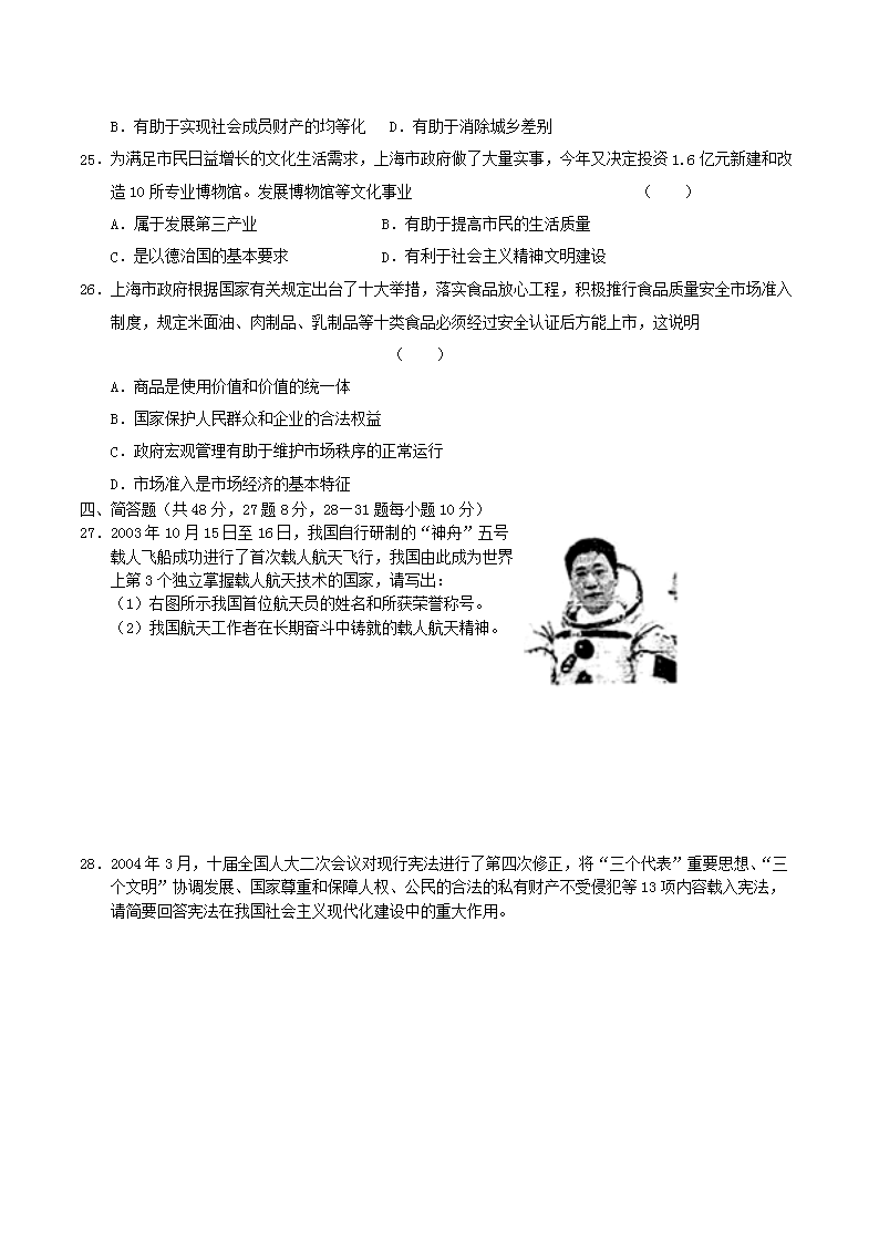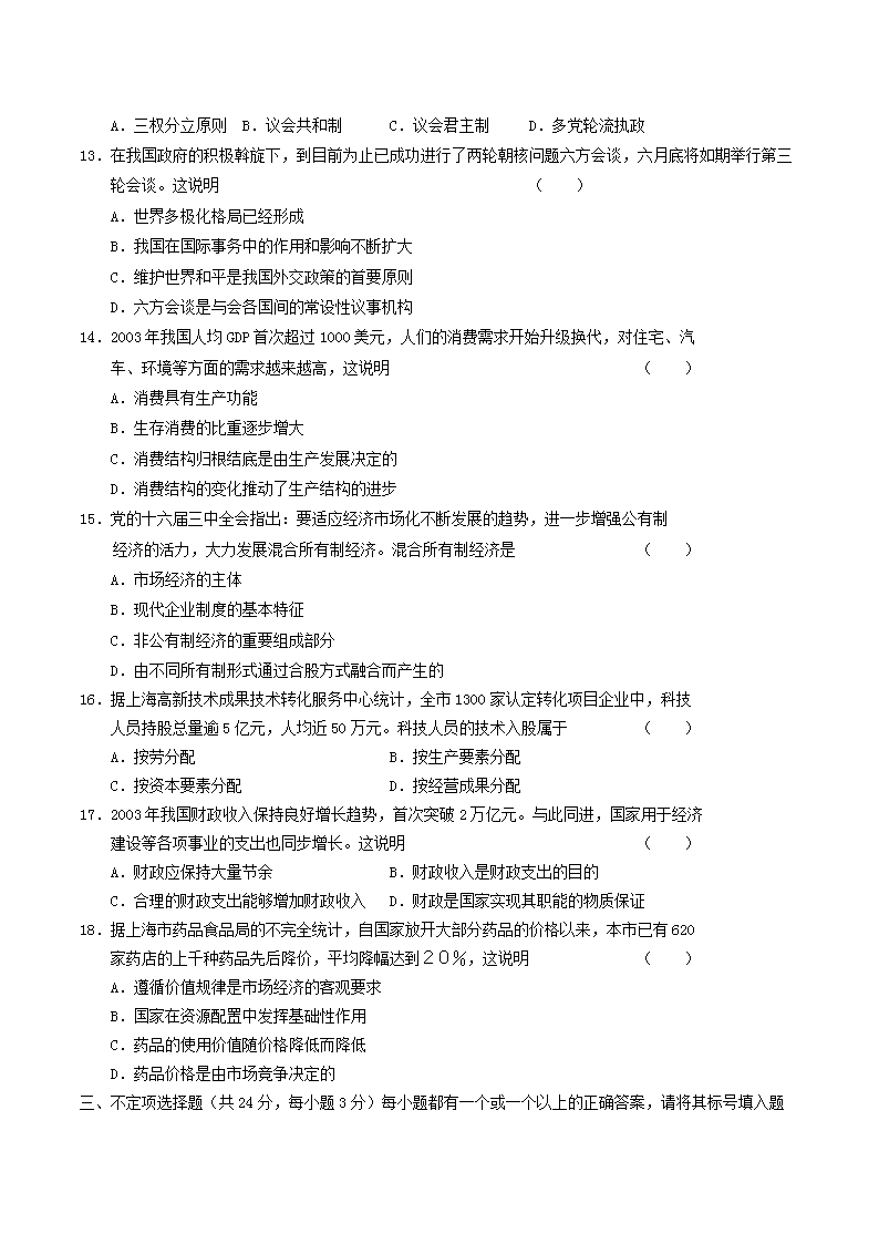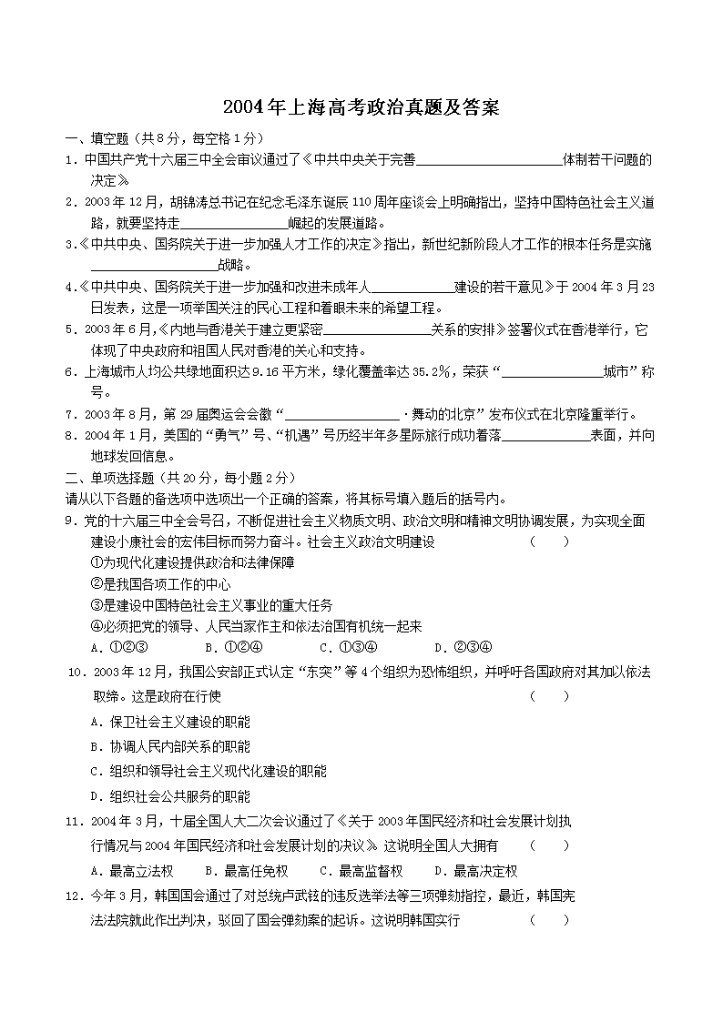 【文档名称】 2004年上海高考政治真题及答案(Word版).doc