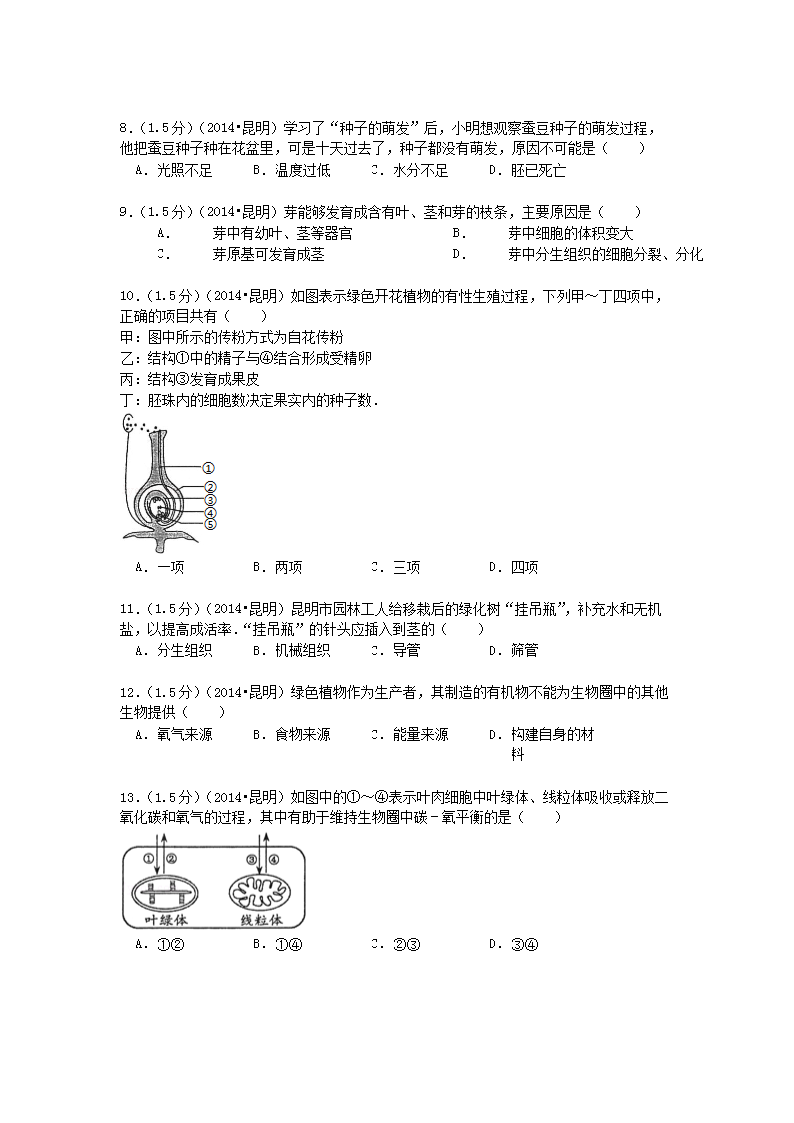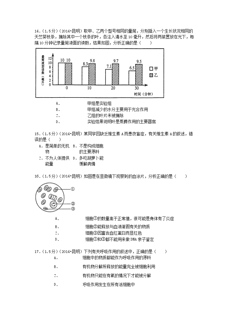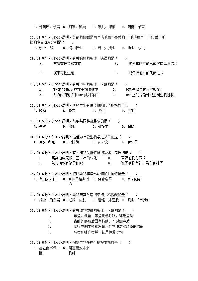 【文档名称】 2014年云南昆明中考生物真题及答案(Word版).doc