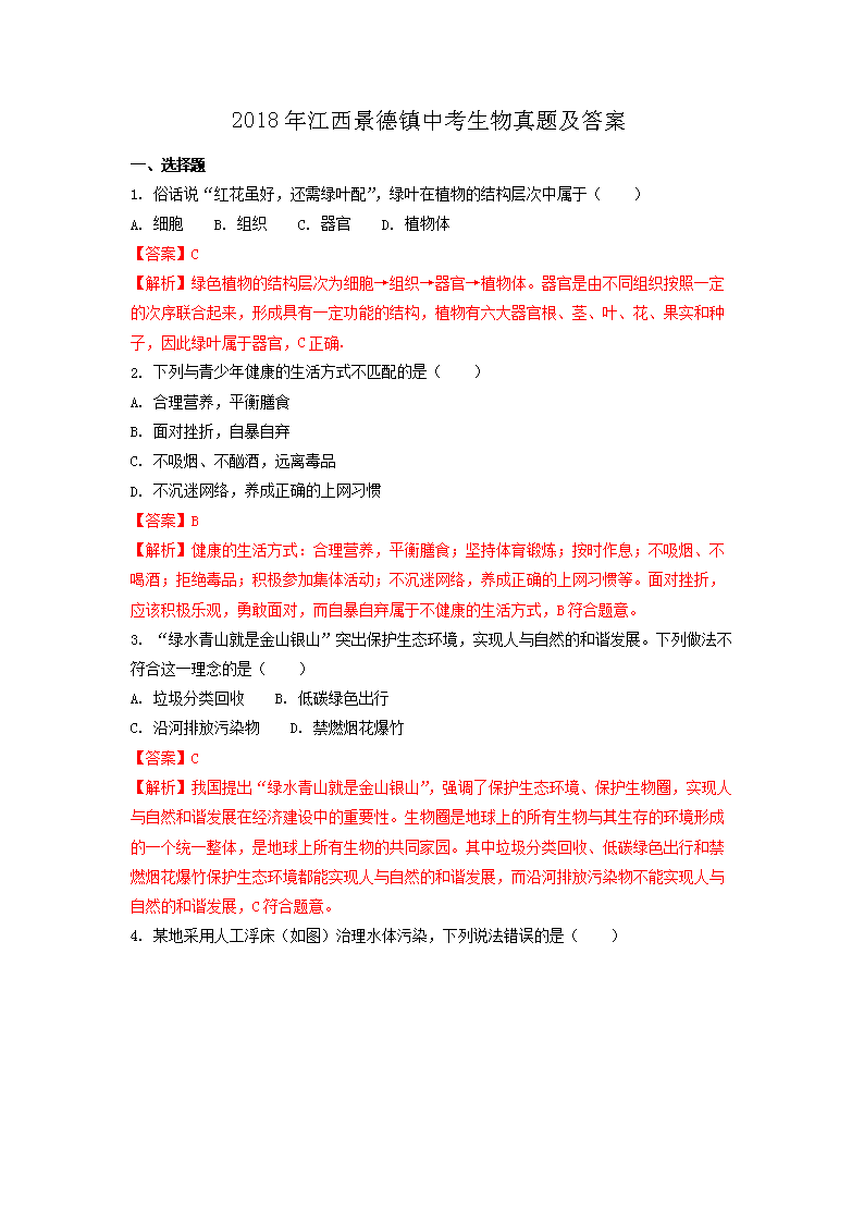 【文档名称】 2018年江西景德镇中考生物真题及答案(Word版).doc