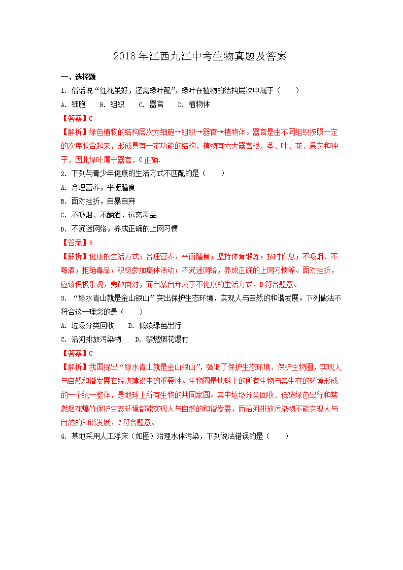 【文档名称】 2018年江西九江中考生物真题及答案(Word版).doc