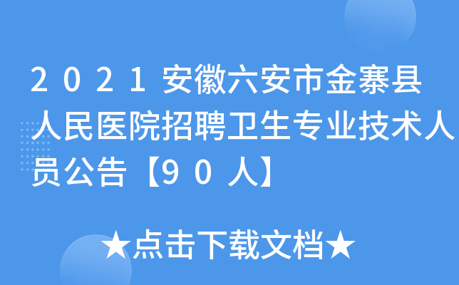 为进一步加强金寨县人民医院卫生专业技术人才队伍建设,不断满足医院快速发展需要,根据县委县政府《关于深化公立医院综合改革实施方案》文件精神,经研究并报县卫健委、县委编办同意,决定2021年继续面向社会自主公开招聘各类卫生专业技术人员90人。现将有关事项公告如下: