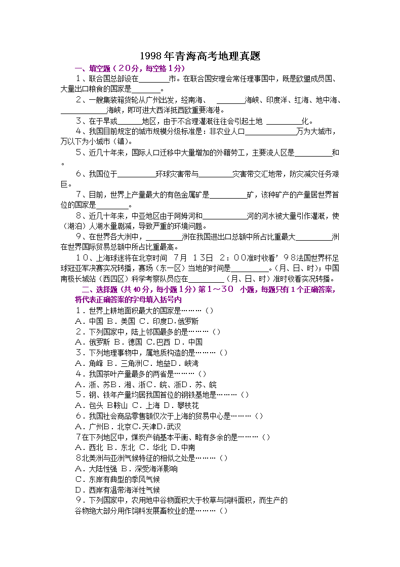 【文档名称】 1998年青海高考地理真题(Word版).doc