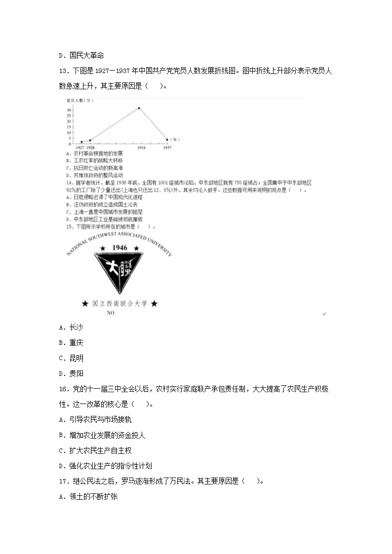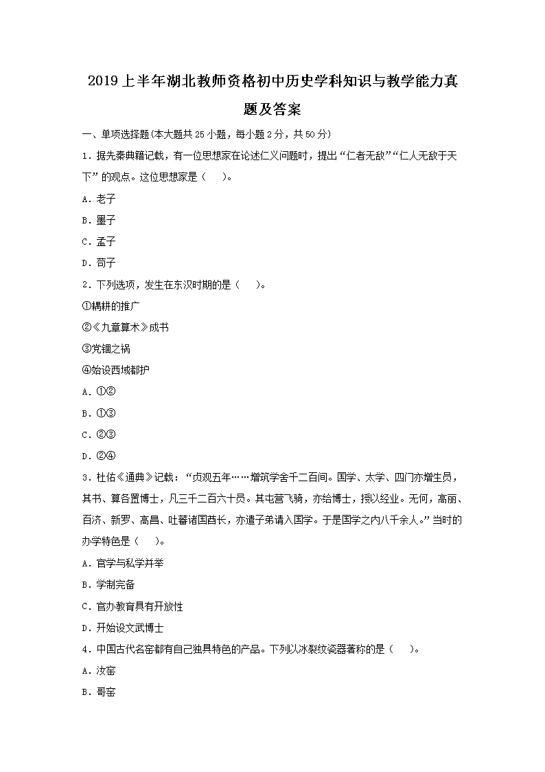 【文档名称】 2019上半年湖北教师资格初中历史学科知识与教学能力真题及答案(Word版).doc