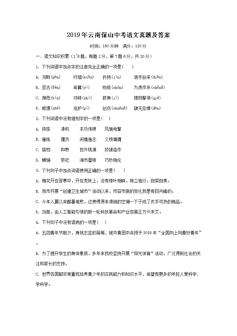 【文档名称】 2019年云南保山中考语文真题及答案(Word版).doc