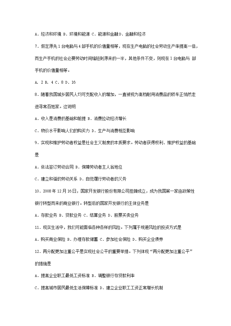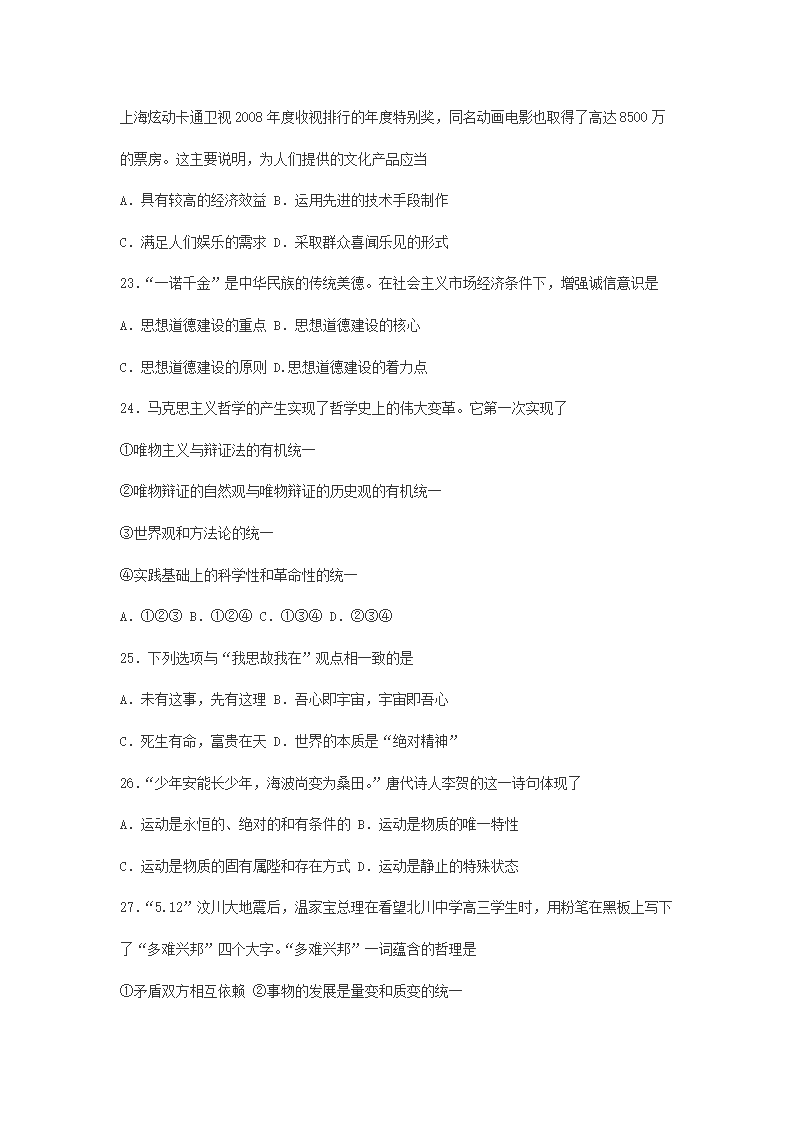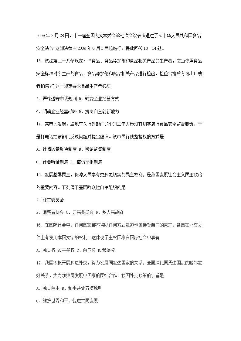 【文档名称】 2009江苏高考政治真题及答案(Word版).doc