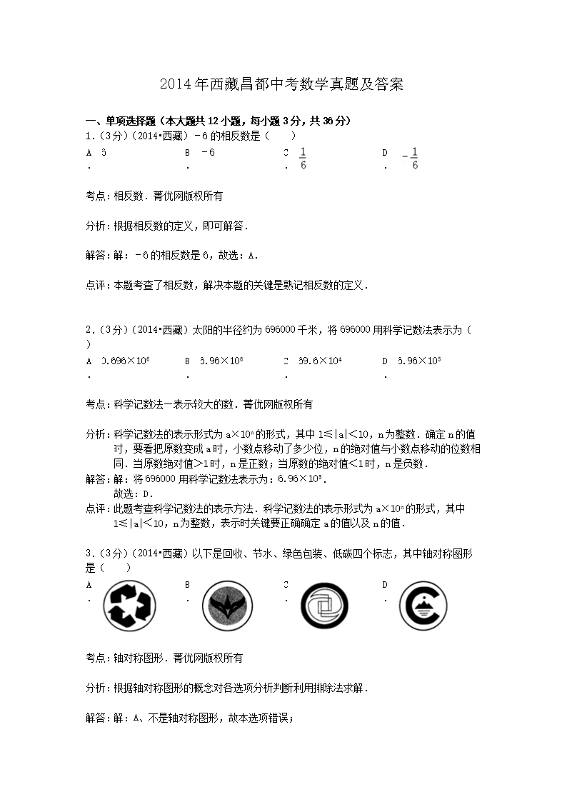 【文档名称】 2014年西藏昌都中考数学真题及答案(Word版).doc