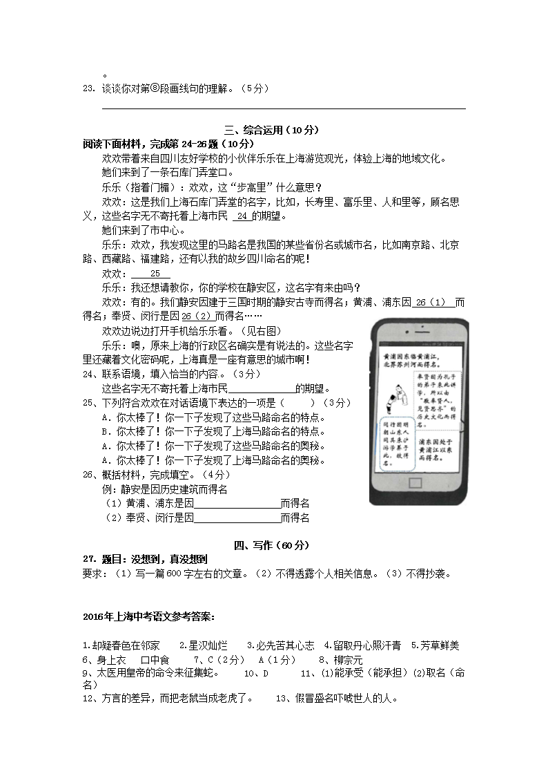 【文档名称】 2016年上海宝山中考语文真题及答案(Word版).doc