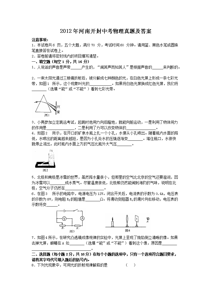 【文档预览】 无忧考网整理发布2012年河南开封中考物理真题及答案(Word版),前五页预览如下: