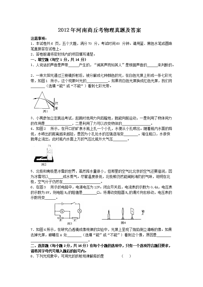 【文档名称】 2012年河南商丘考物理真题及答案(Word版).doc
