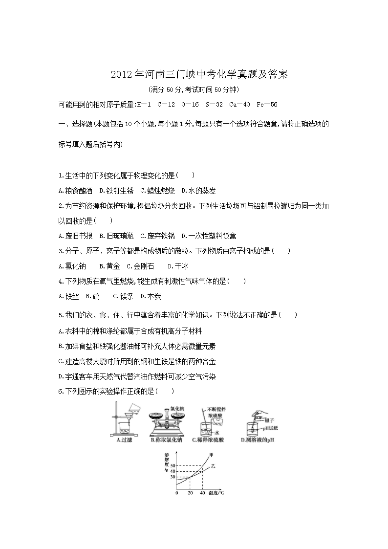 【文档名称】 2012年河南三门峡中考化学真题及答案(Word版).doc