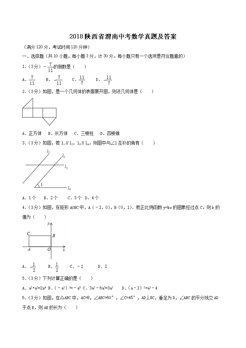 【文档名称】 2018陕西省渭南中考数学真题及答案(Word版).doc