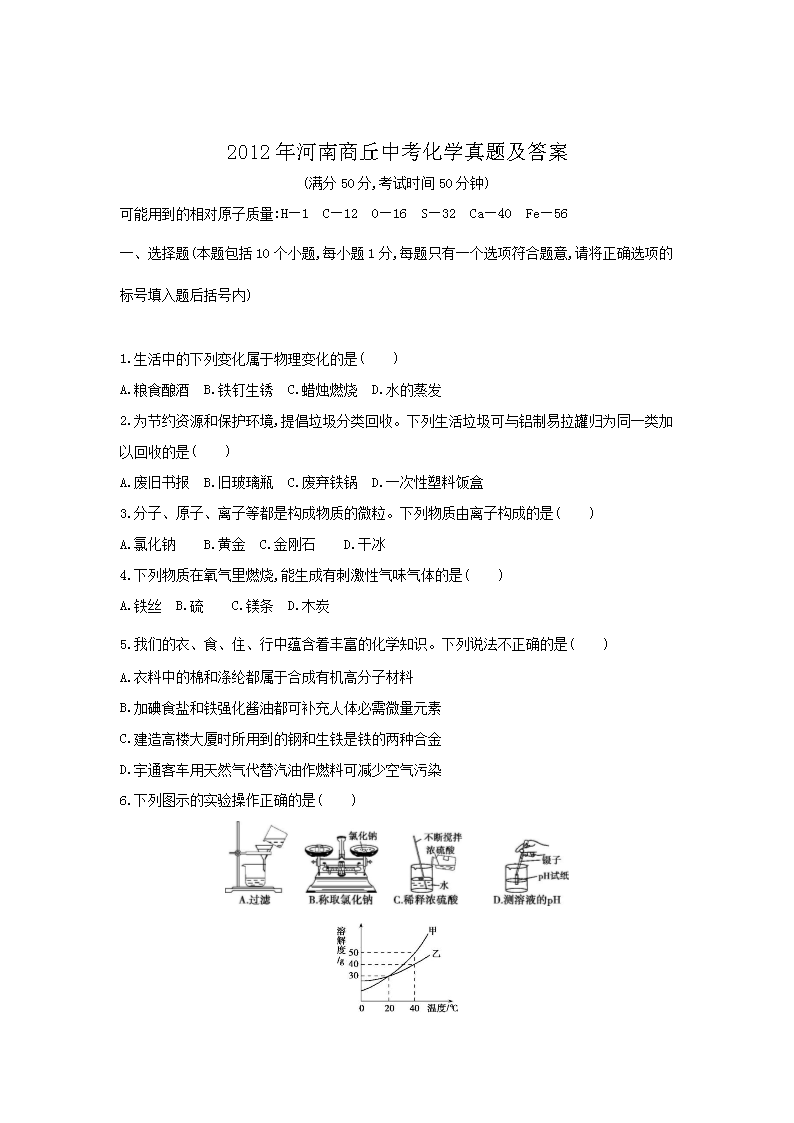 【文档名称】 2012年河南商丘中考化学真题及答案(Word版).doc