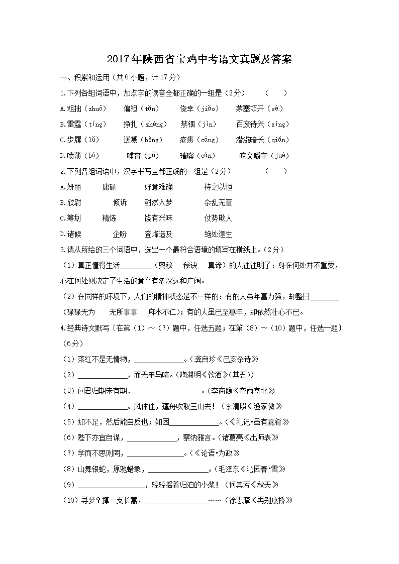 【文档名称】 2017年陕西省宝鸡中考语文真题及答案(Word版).doc
