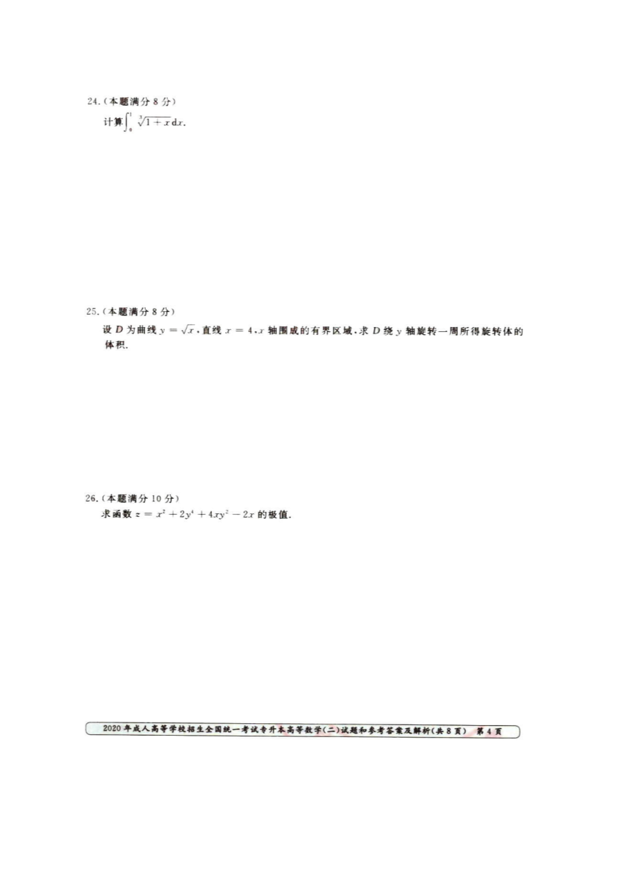 【文档名称】 2020年江西成人高考专升本高数(二)真题及答案(图片版).doc