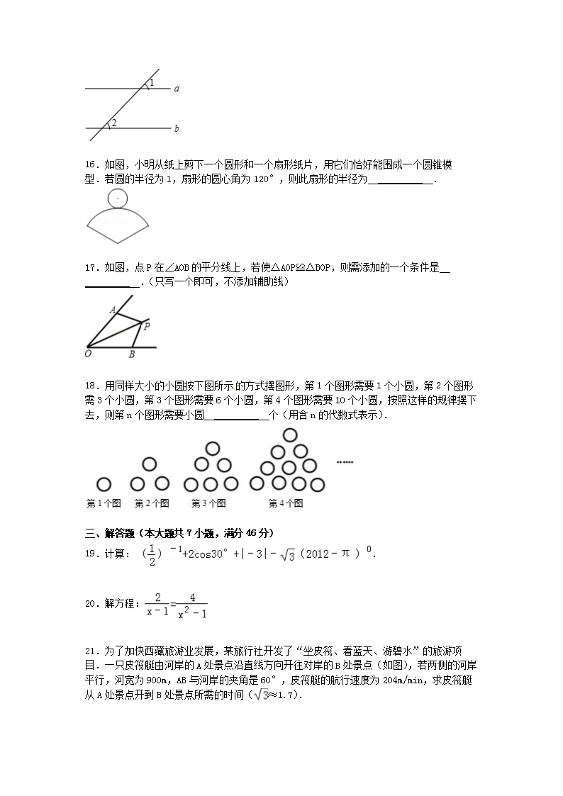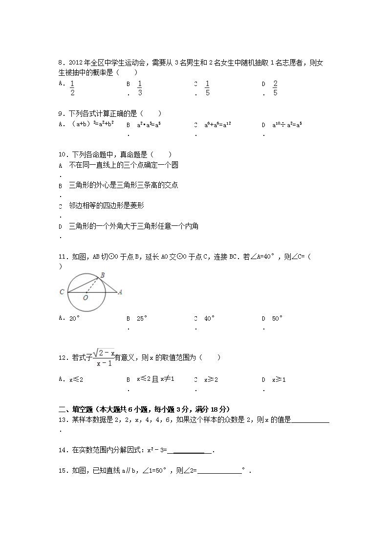 【文档名称】 2012年西藏那曲中考数学真题及答案(Word版).doc