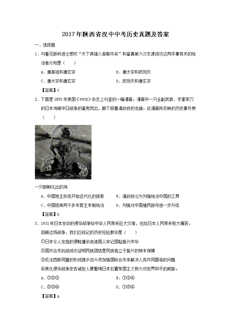 【文档名称】 2017年陕西省汉中中考历史真题及答案(Word版).doc