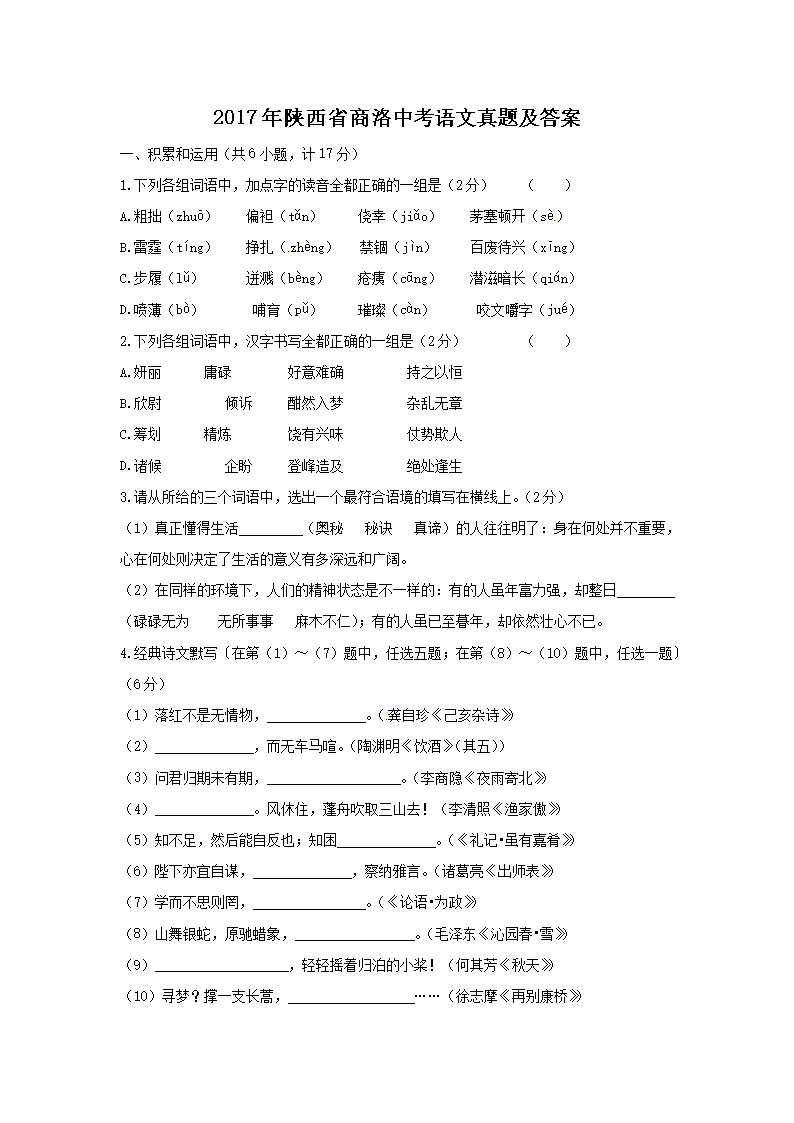 【文档名称】 2017年陕西省商洛中考语文真题及答案(Word版).doc