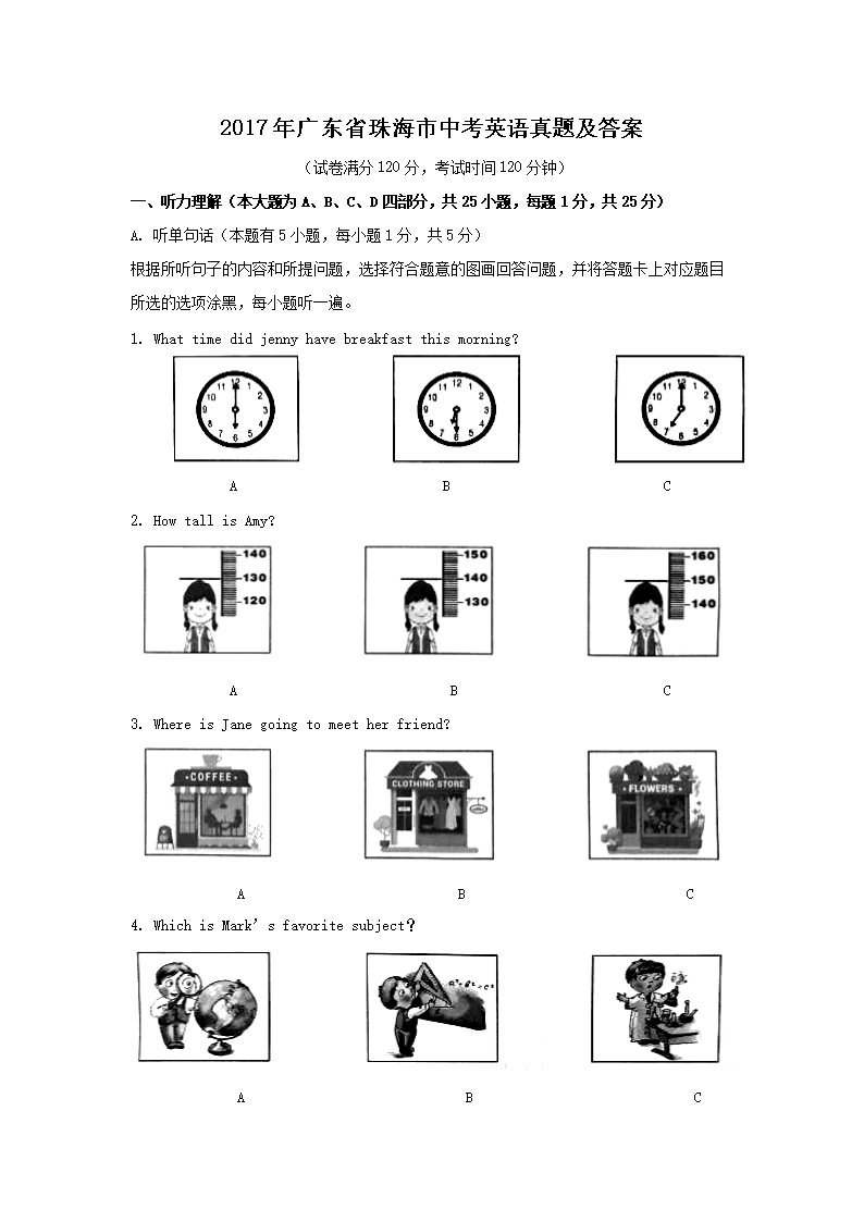 【文档名称】 2017年广东省珠海市中考英语真题及答案(Word版).doc
