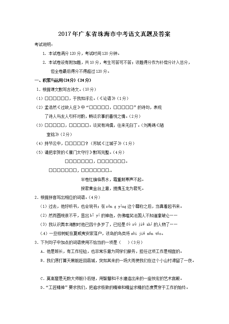 【文档名称】 2017年广东省珠海市中考语文真题及答案(Word版).doc