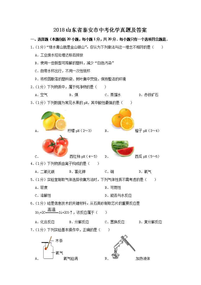 【文档预览】 无忧考网整理发布2018山东省泰安市中考化学真题及答案(Word版),前五页预览如下: