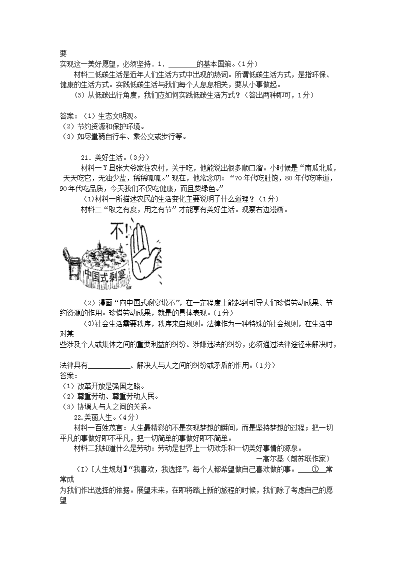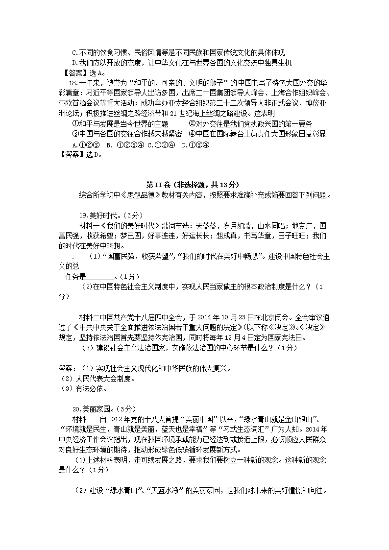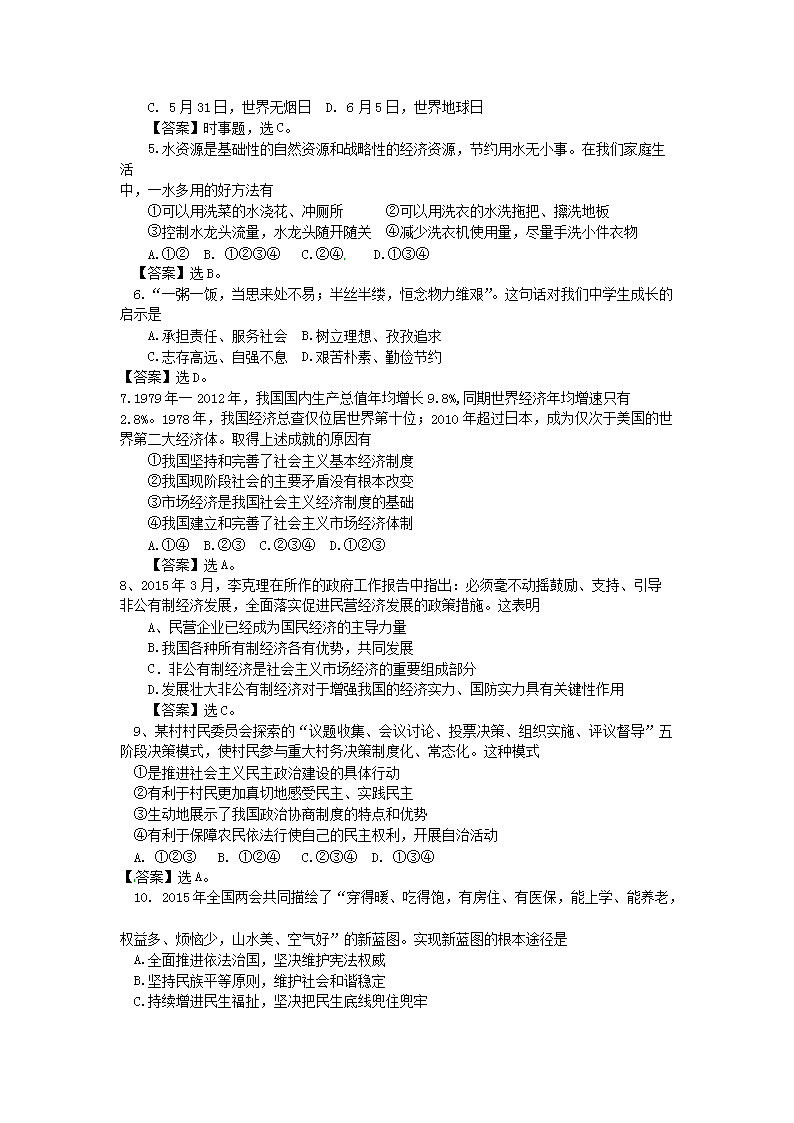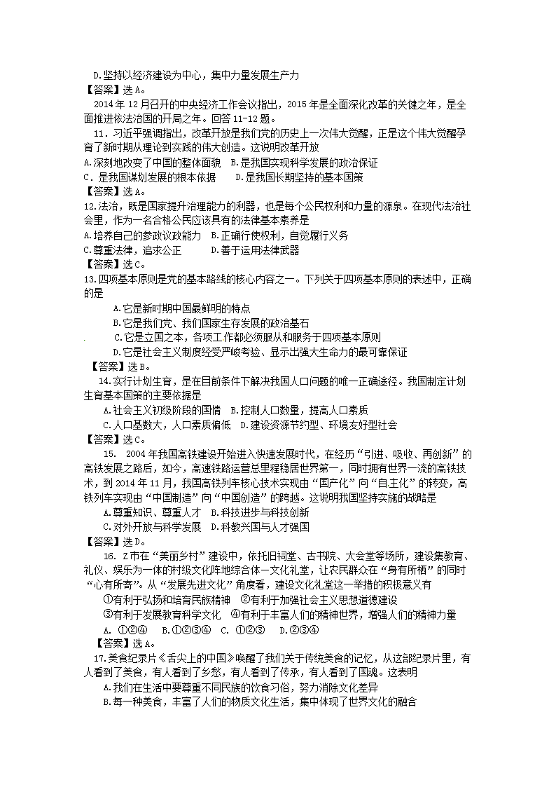 【文档名称】 2015四川省自贡市中考政治真题及答案(Word版).doc