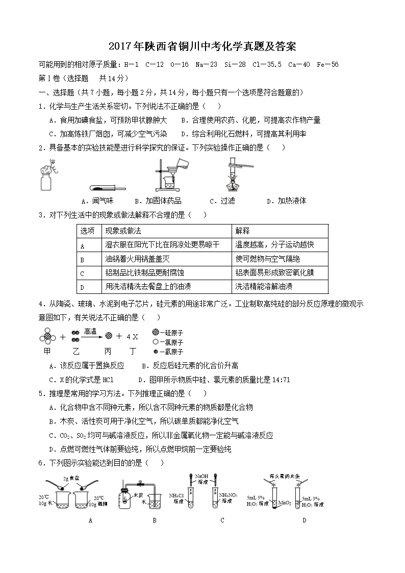 【文档预览】 无忧考网整理发布2017年陕西省铜川中考化学真题及答案(Word版),前五页预览如下: