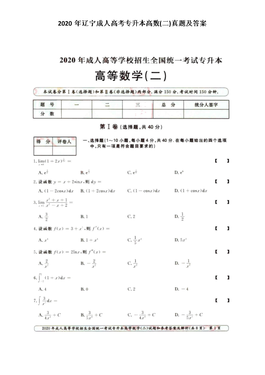 【文档名称】 2020年辽宁成人高考专升本高数(二)真题及答案(图片版).doc
