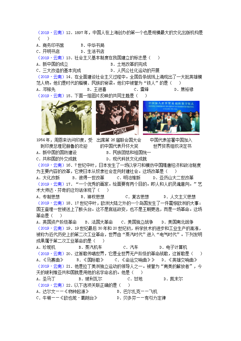 【文档名称】 2019年云南玉溪中考历史真题及答案(Word版).doc