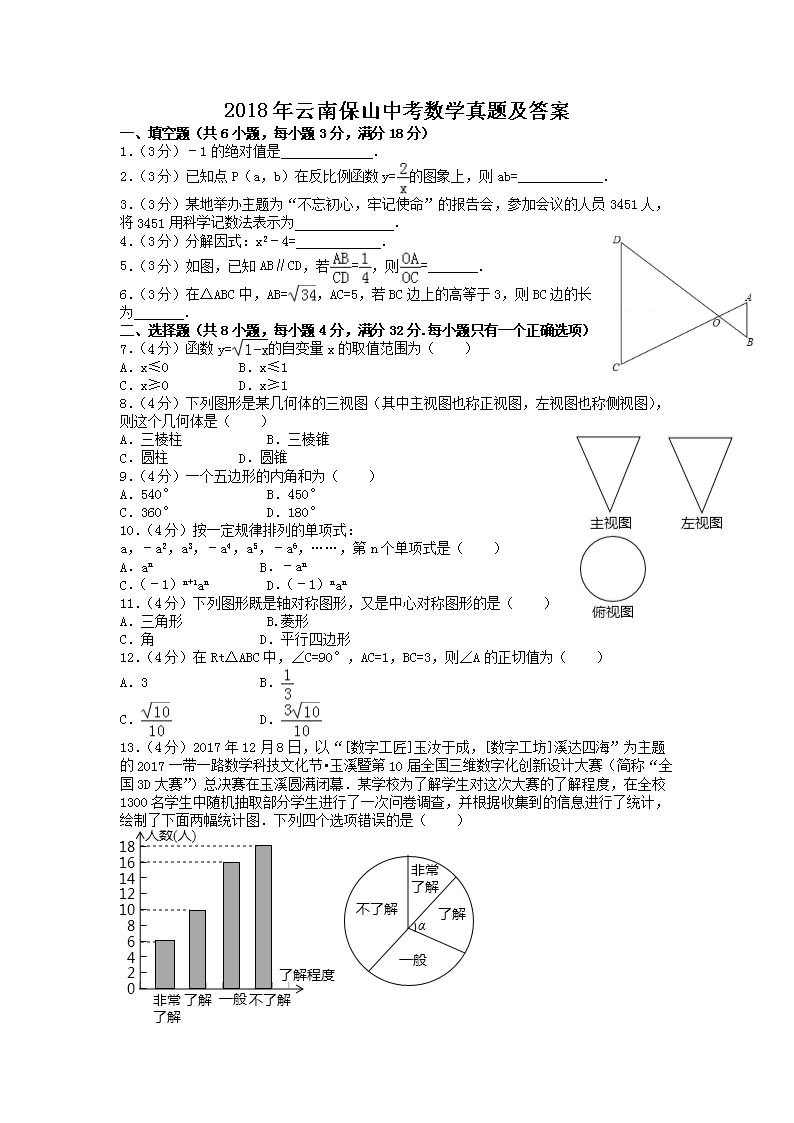 【文档名称】 2018年云南保山中考数学真题及答案(Word版).doc