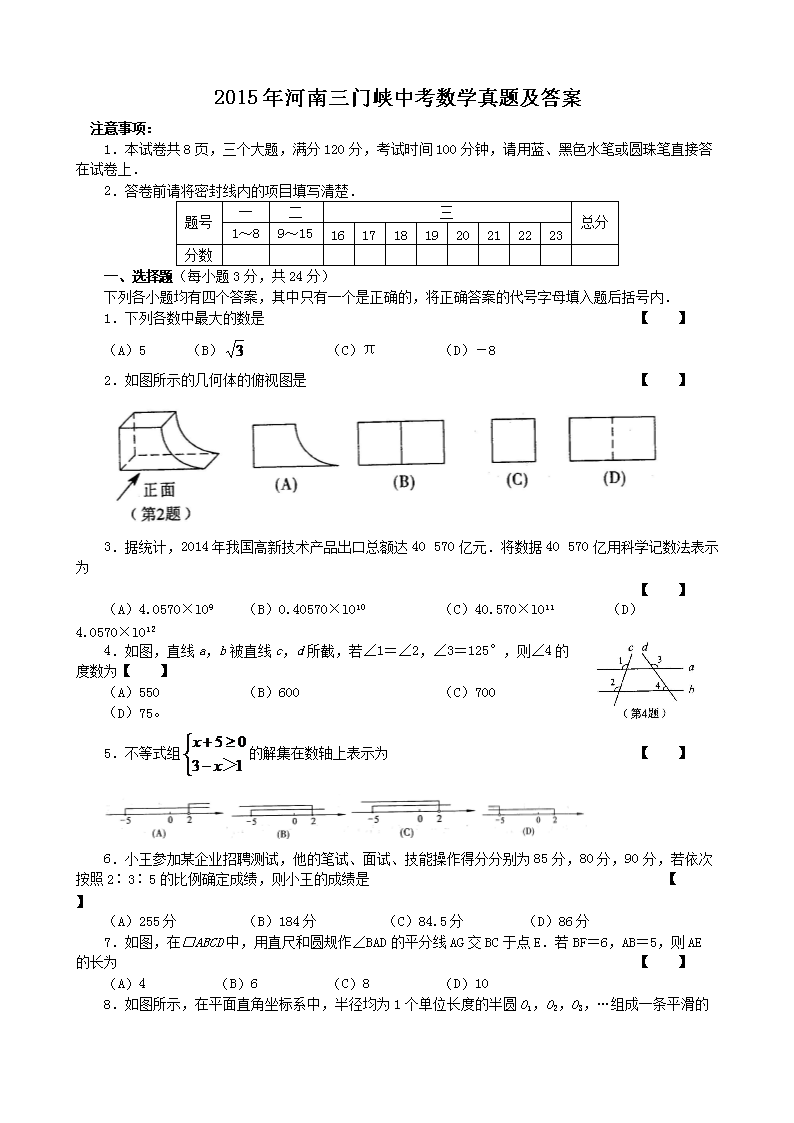 【文档名称】 2015年河南三门峡中考数学真题及答案(Word版).doc