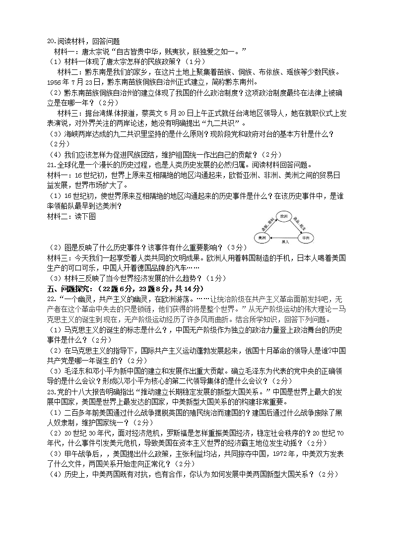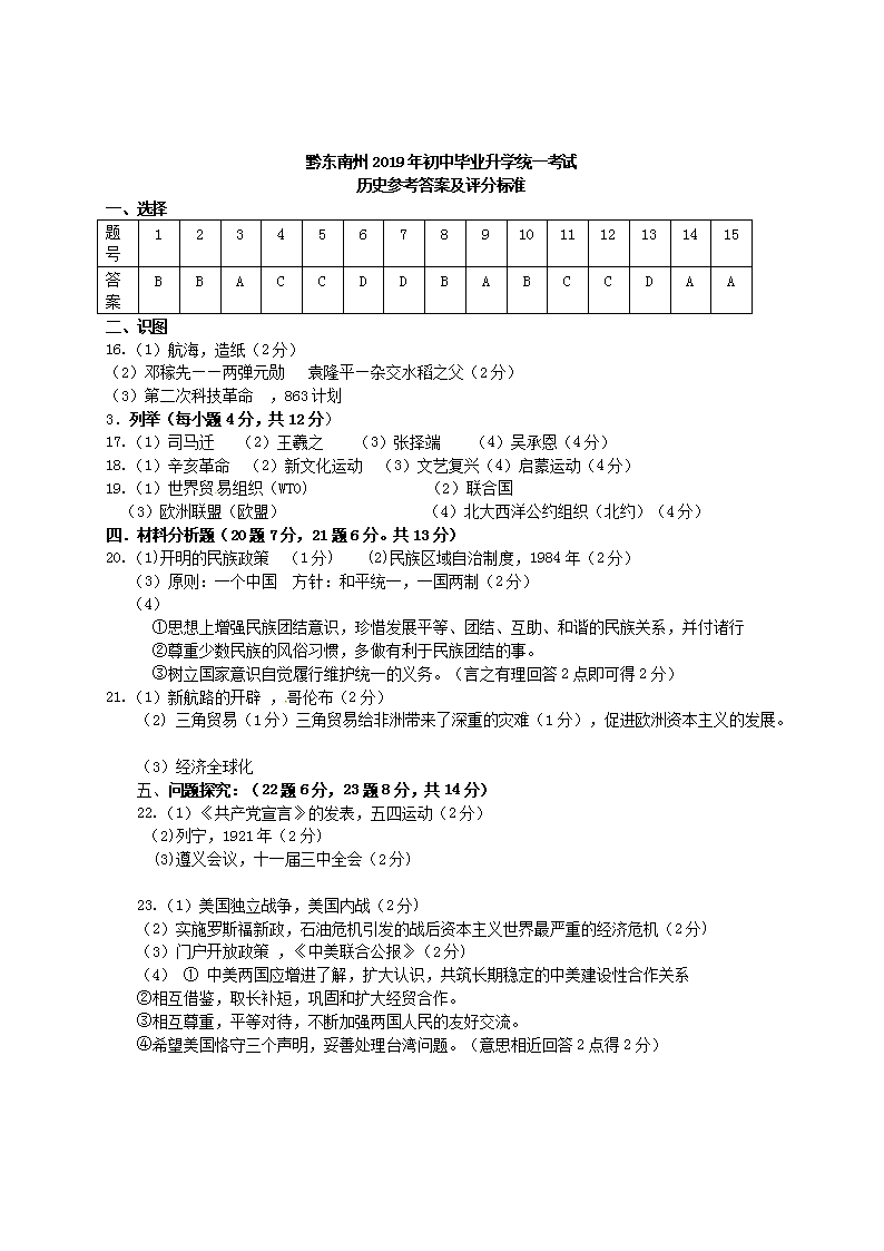 【文档名称】 2019年贵州黔东南州中考历史真题及答案(Word版).doc