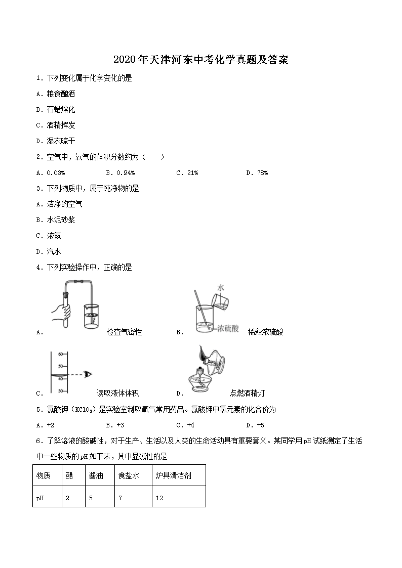 【文档名称】 2020天津河东中考化学真题及答案(Word版).doc