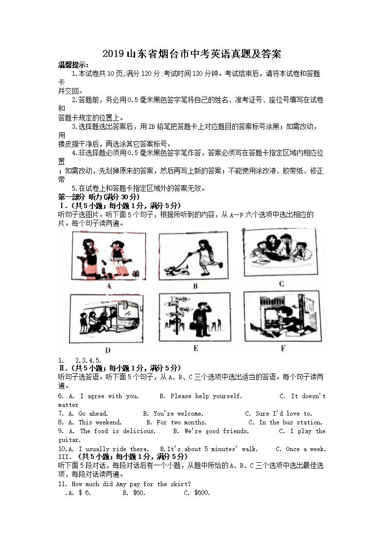 【文档名称】 2019山东省烟台市中考英语真题及答案(Word版).doc