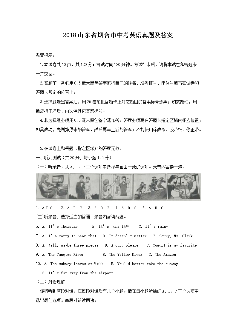 【文档名称】 2018山东省烟台市中考英语真题及答案(Word版).doc