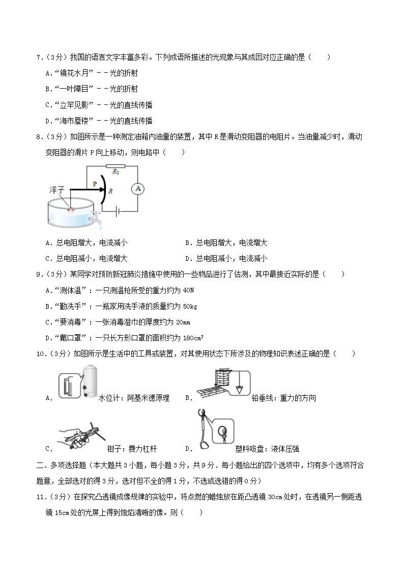 【文档名称】 2020天津武清中考物理真题及答案(Word版).doc
