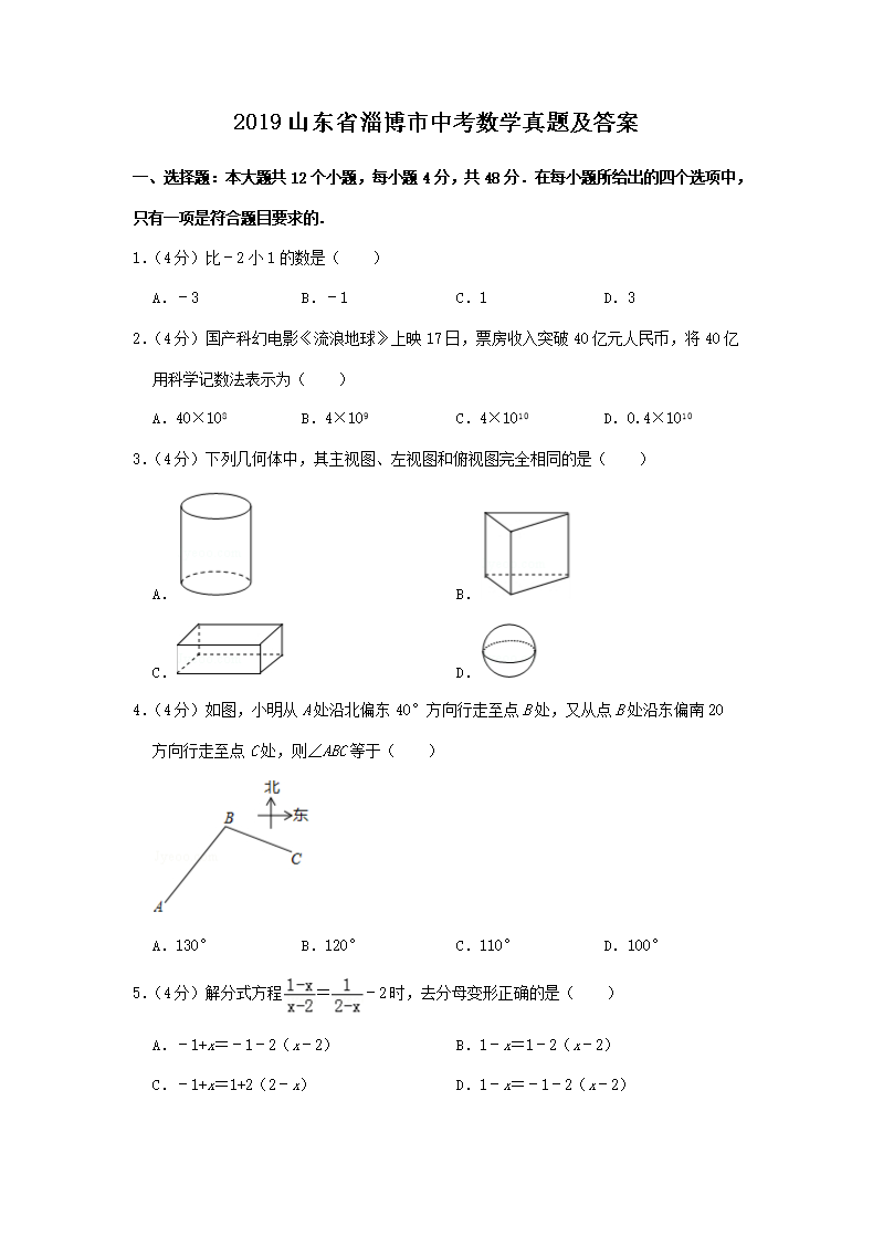 【文档名称】 2019山东省淄博市中考数学真题及答案(Word版).doc