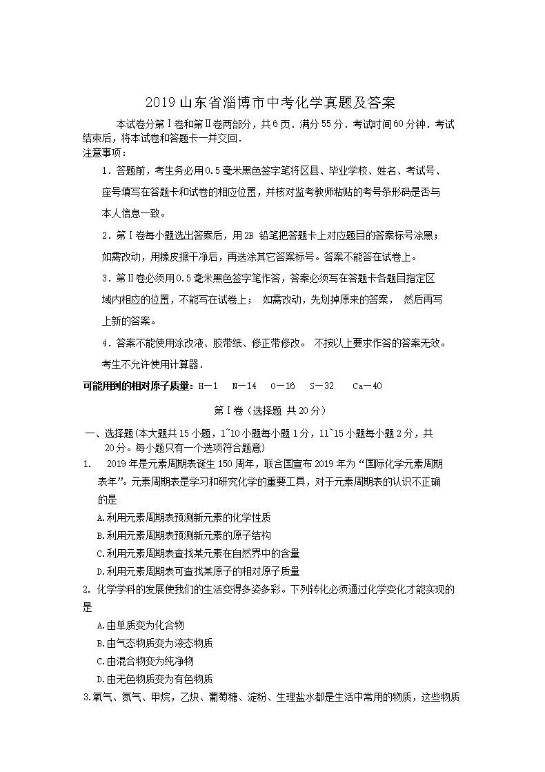【文档预览】 无忧考网整理发布2019山东省淄博市中考化学真题及答案(Word版),前五页预览如下: