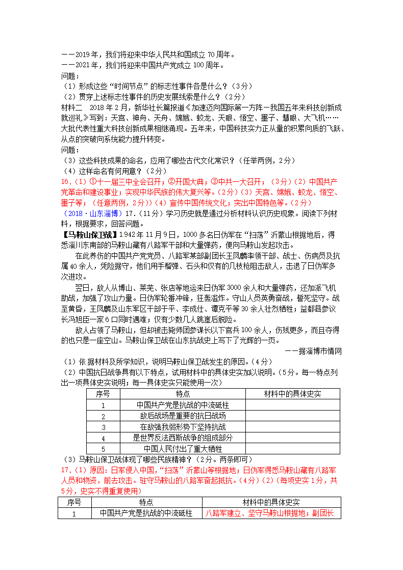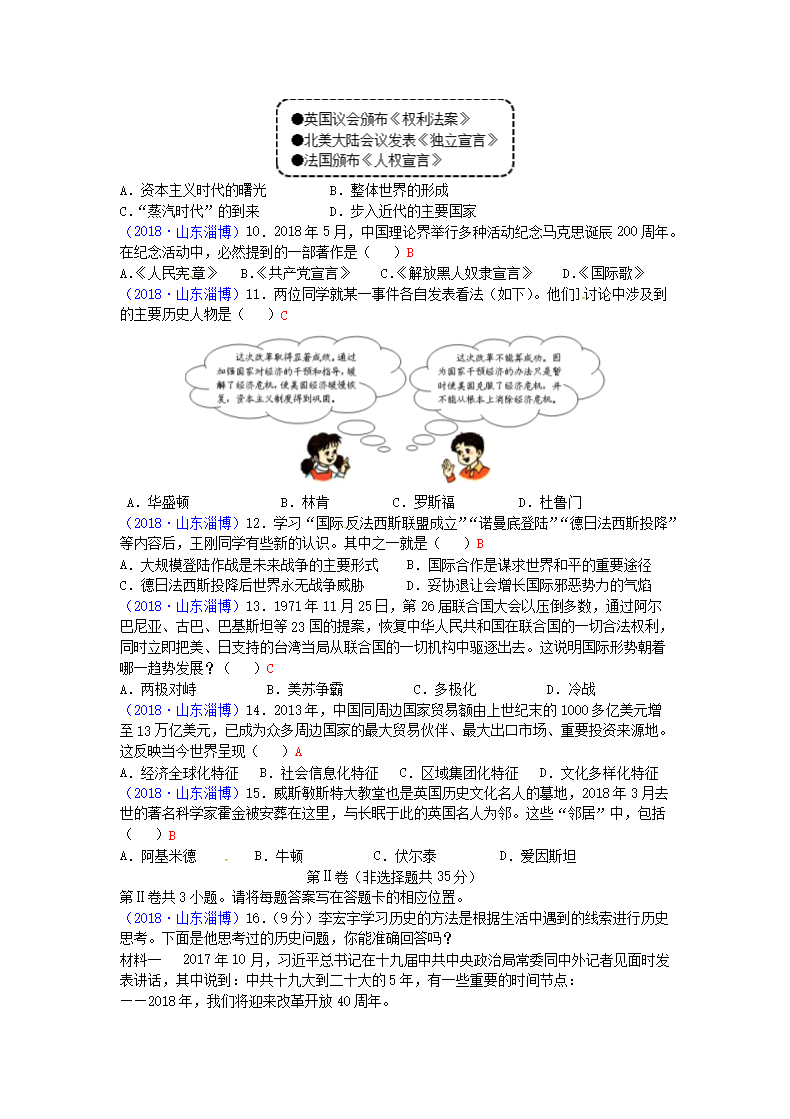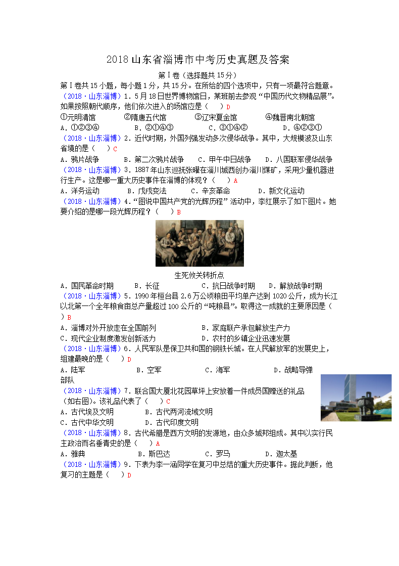 【文档名称】 2018山东省淄博市中考历史真题及答案(Word版).doc