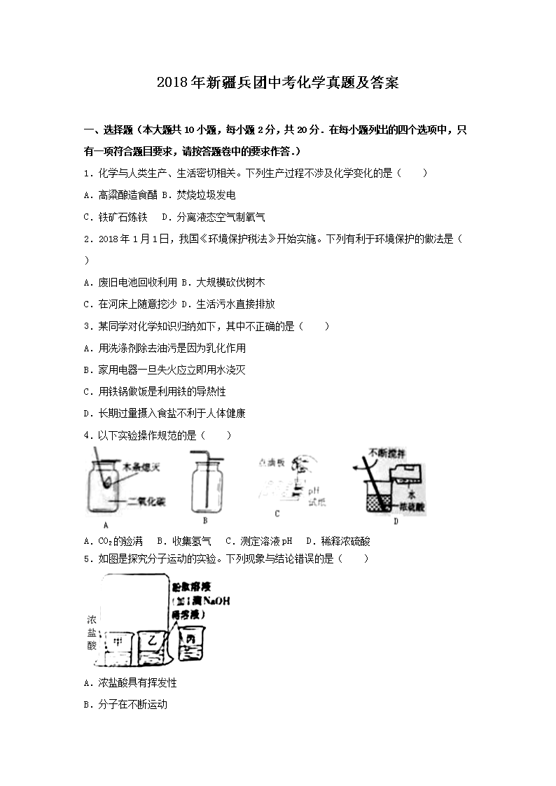 【文档预览】 无忧考网整理发布2018年新疆兵团中考化学真题及答案(Word版),前五页预览如下: