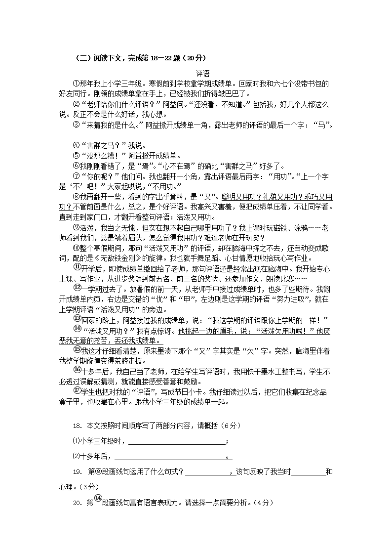 【文档预览】 无忧考网整理发布2015年上海金山中考语文真题及答案(Word版),前五页预览如下: