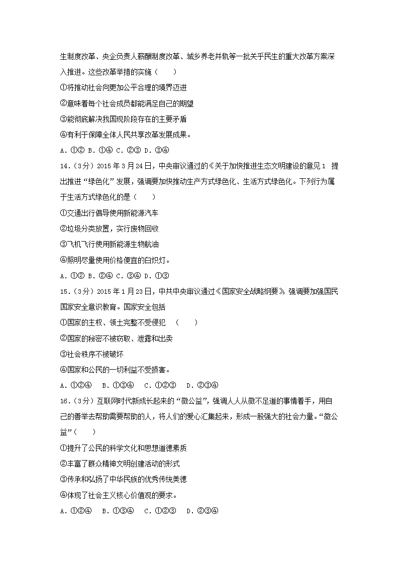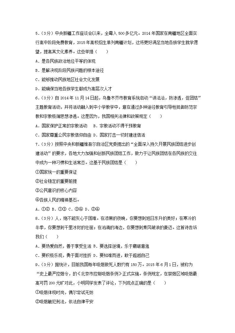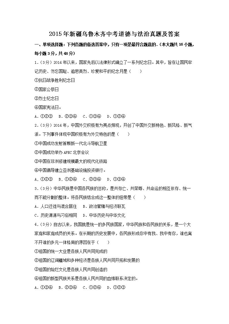 【文档名称】 2015年新疆乌鲁木齐中考道德与法治真题及答案(Word版).doc