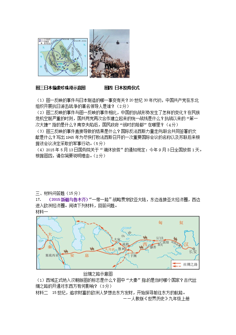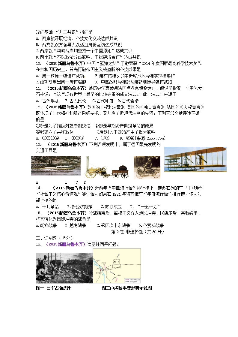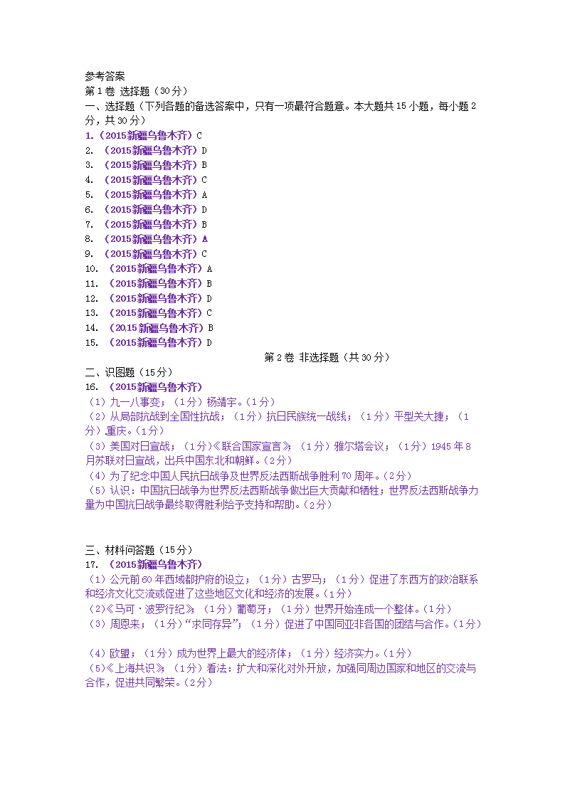 【文档名称】 2015年新疆乌鲁木齐中考历史真题及答案(Word版).doc