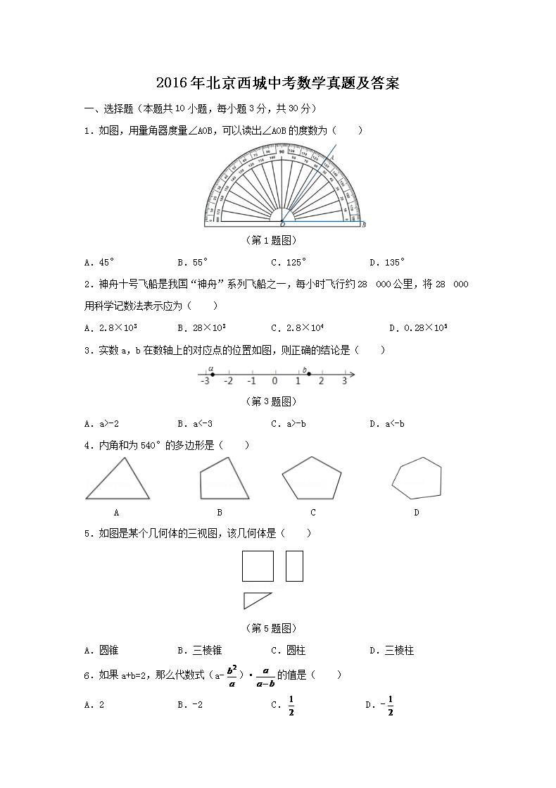 【文档名称】 2016年北京西城中考数学真题及答案(Word版).doc