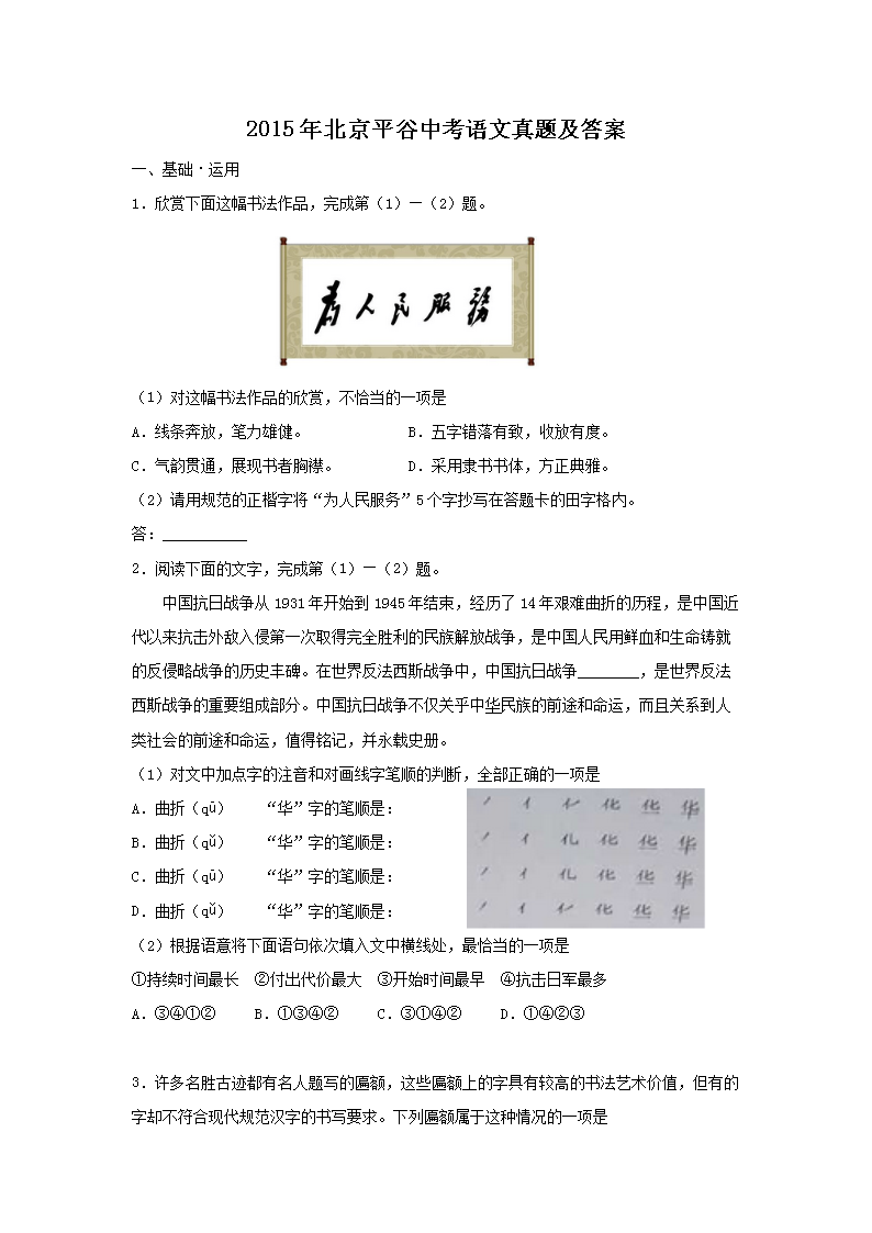 【文档名称】 2015年北京平谷中考语文真题及答案(Word版).doc