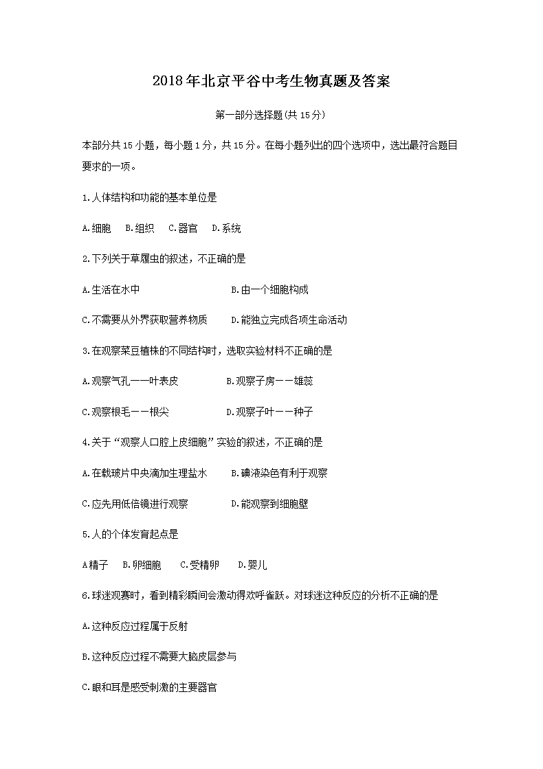 【文档预览】 无忧考网整理发布2018年北京平谷中考生物真题及答案(Word版),前五页预览如下: