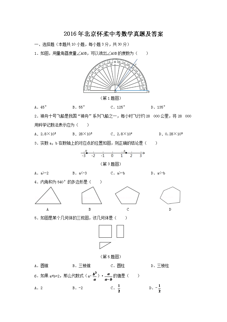 【文档名称】 2016年北京怀柔中考数学真题及答案(Word版).doc