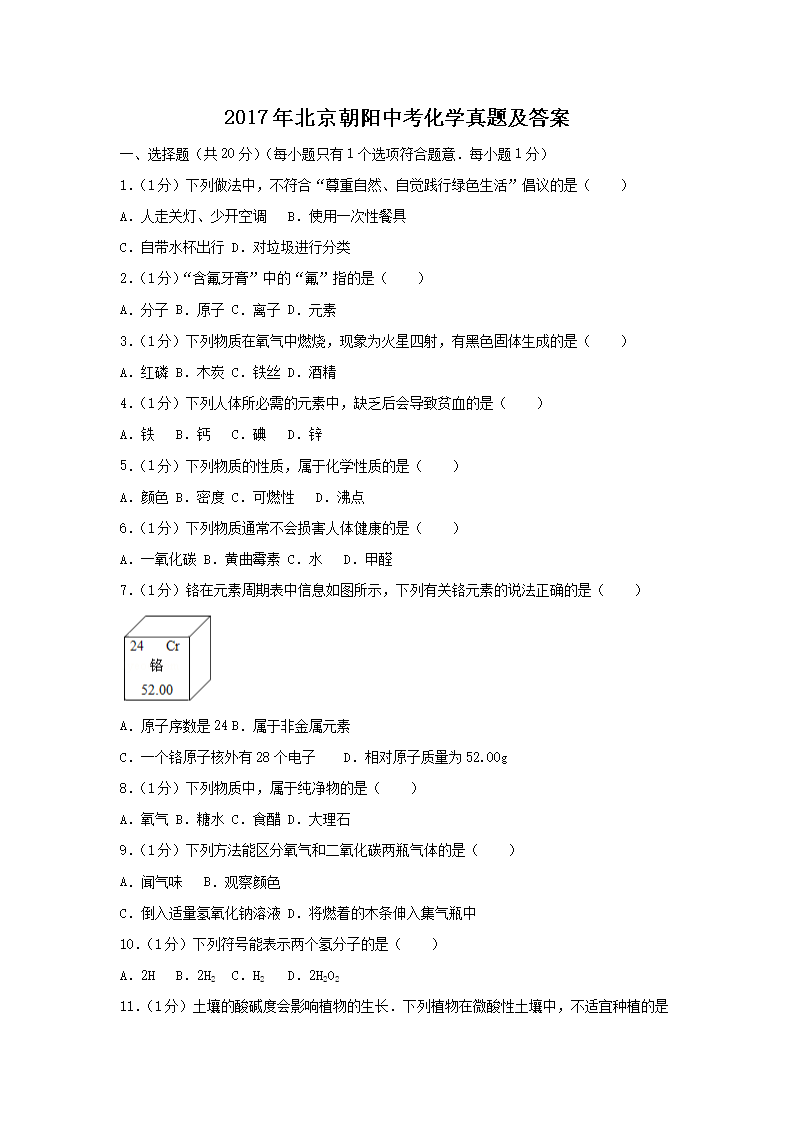 【文档预览】 无忧考网整理发布2017年北京朝阳中考化学真题及答案(Word版),前五页预览如下: