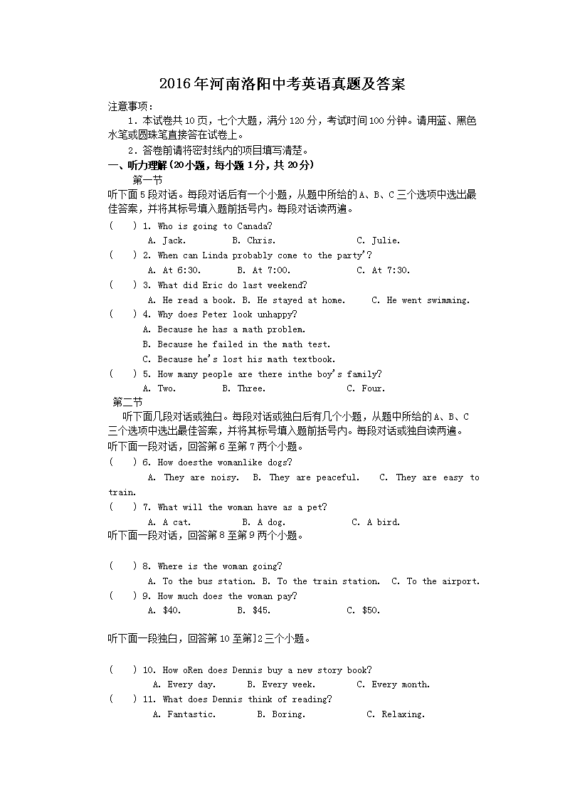 【文档预览】 无忧考网整理发布2016年河南洛阳中考英语真题及答案(Word版),前五页预览如下:
