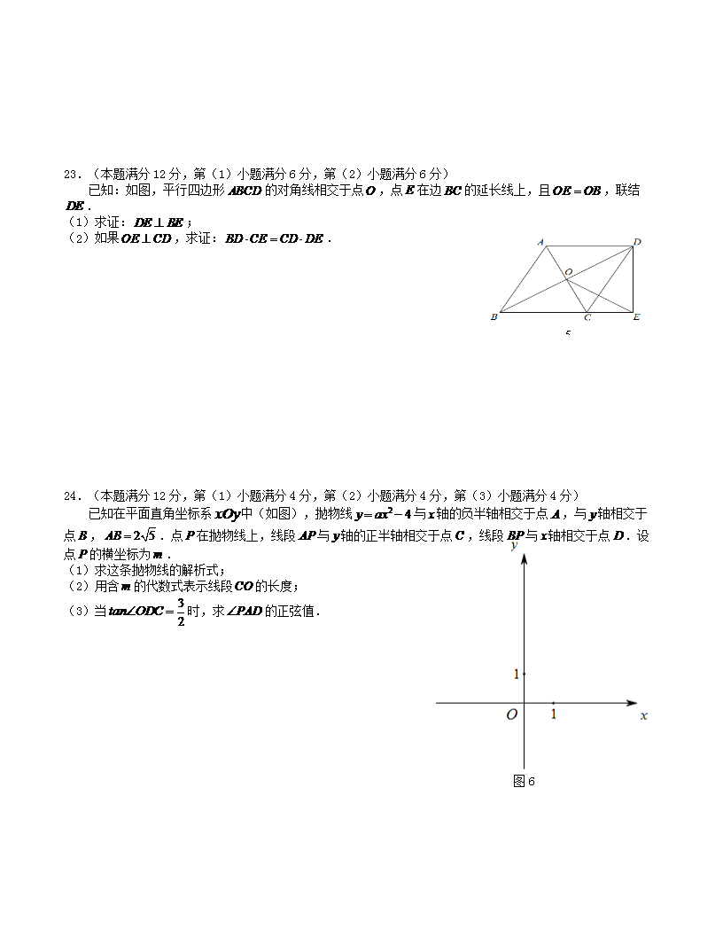 【文档名称】 2015年上海闵行中考数学真题及答案(Word版).doc