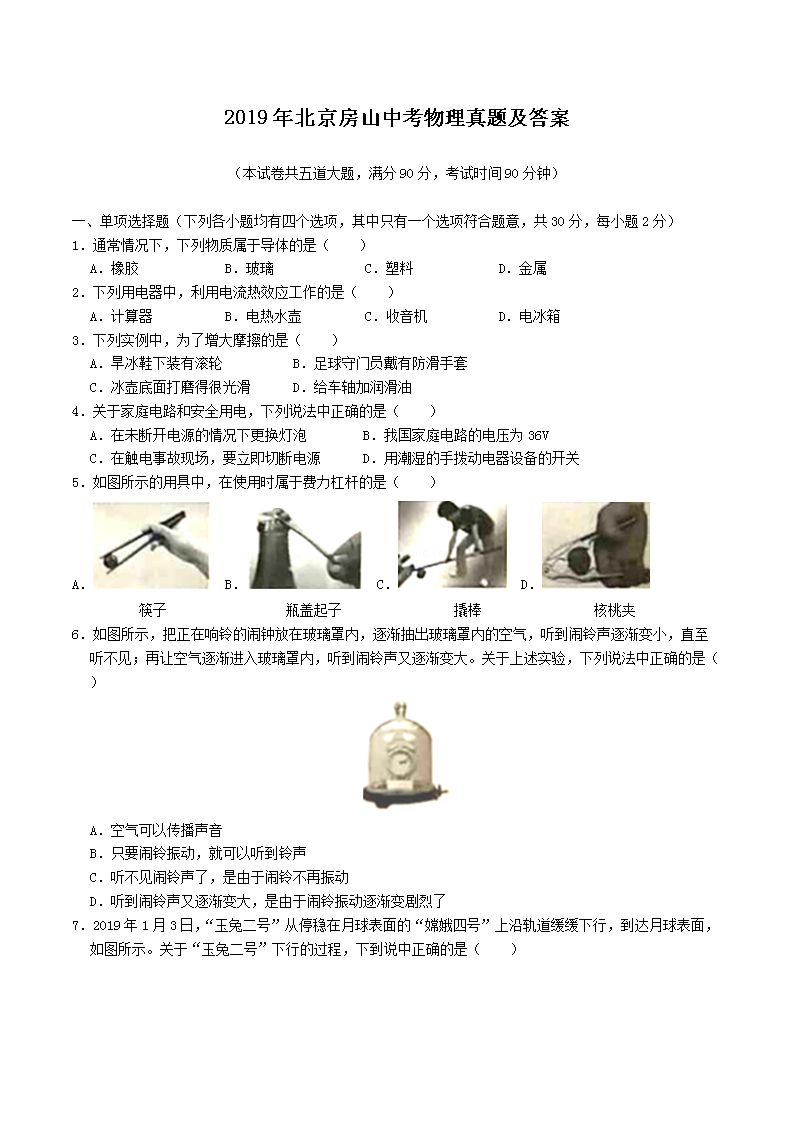 【文档名称】 2019年北京房山中考物理真题及答案(Word版).doc